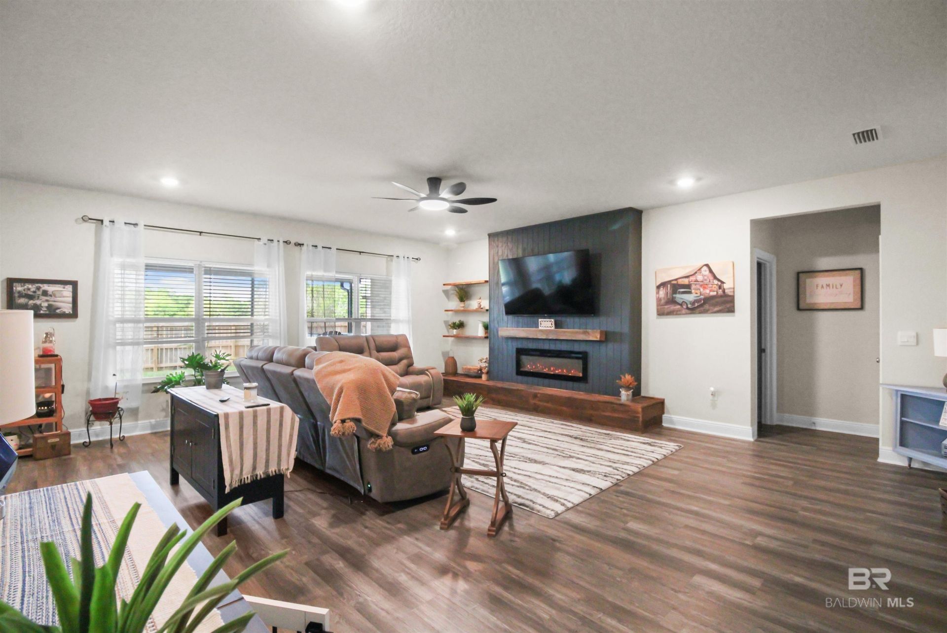 Welcome home to a place where everyday living feels like a retreat. This beautifully crafted new property in Elberta sits on a premium corner lot with peaceful pond views, offering added privacy and a scenic backdrop that enhances the coastal lifestyle.From the moment you step inside, soaring 9 foot ceilings, custom finishes, and thoughtfully designed details create an open, airy, and welcoming atmosphere. Natural light dances across clean lines and custom lighting, highlighting a modern design that feels both elevated and effortless. This smart home features a true split floor plan designed for comfort, functionality, and privacy.The heart of the home is a stylish kitchen with a striking backsplash, perfect for gathering with family and friends. With no carpeting throughout, the home offers a clean, seamless flow that is both beautiful and easy to maintain. An electric fireplace adds warmth and ambiance, creating the perfect setting for cozy evenings and relaxed entertaining.Step outside to your covered back porch and unwind in your private hot tub while overlooking tranquil pond views. Added concrete, palm trees, and thoughtful outdoor upgrades create a setting that feels like a permanent vacation. Practical features such as gutters, a widened driveway, and epoxy garage floors add durability, polish, and everyday convenience.Perfectly located in Elberta, you are just miles from shopping, dining, and the sugar white sandy beaches of Gulf Shores. Whether you are starting your mornings with coffee under the palms or ending your days with sunset breezes by the water, this home offers the lifestyle you have been dreaming of.This is more than a home. It is coastal living, reimagined. Buyer to verify all information during due diligence.